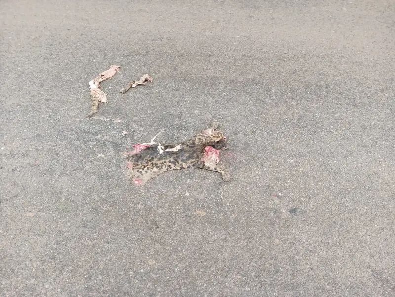 ಚಿರತೆ ಮರಿಯನ್ನು ಹೋಲುವ ಈ ಪ್ರಾಣಿ ಯಾವುದೋ ಅಪರಿಚಿತ ವಾಹನಕ್ಕೆ ಸಿಕ್ಕಿ ಮರಣ ಹೊಂದಿದೆ.