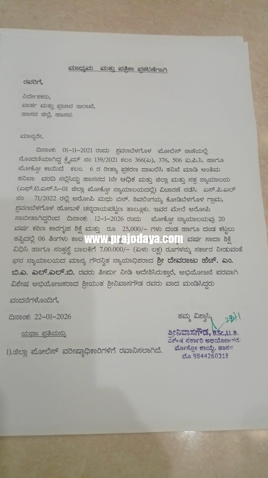 ಶ್ರವಣಬೆಳಗೊಳ ಹೋಬಳಿ ಕೋಡಿಬೆಳಗೊಳ ಗ್ರಾಮದ ಮಧು ಎಂಬಾತನಿಗೆ ಶಿಕ್ಷೆ ವಿಧಿಸಲಾಗಿದೆ. 2023ರಲ್ಲಿ ದಾಖಲಾಗಿದ್ದ ಪೋಕ್ಸೋ ಪ್ರಕರಣ ಸಂಬಂಧ ಶ್ರವಣಬೆಳಗೊಳ ಠಾಣೆ ಪೊಲೀಸರು ನ್ಯಾಯಾಲಯಕ್ಕೆ ದೋಷಾರೋಪಣೆ ಪಟ್ಟಿ ಸಲ್ಲಿಸಿದ್ದರು.