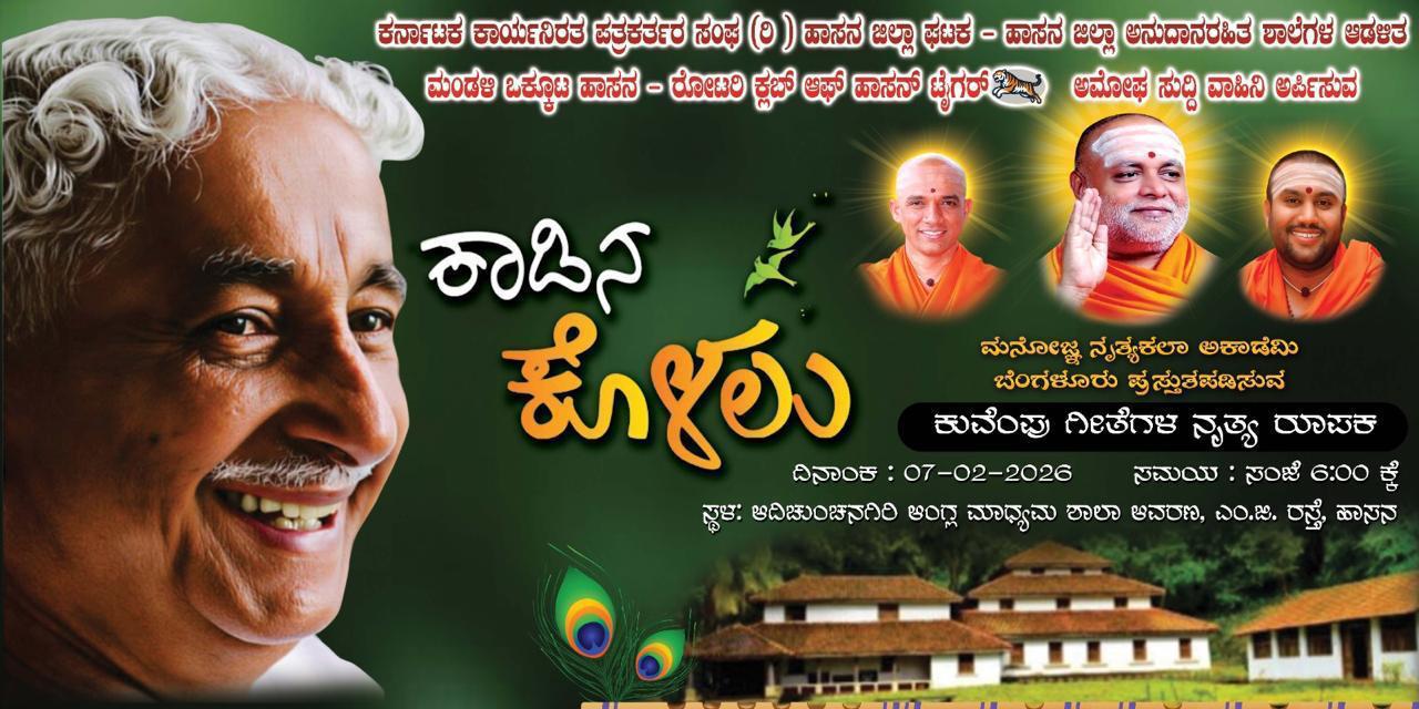 ಹಾಸನ: ಕರ್ನಾಟಕ ಕಾರ್ಯನಿರತ ಪತ್ರಕರ್ತರ ಸಂಘ ಜಿಲ್ಲಾ ಘಟಕ, ಹಾಸನ ಜಿಲ್ಲಾ ಅನುದಾನರಹಿತ ಶಾಲೆಗಳ ಆಡಳಿತ ಮಂಡಳಿ ಒಕ್ಕೂಟ, ರೋಟರಿ ಕ್ಲಬ್ ಆಫ್ ಹಾಸನ್ ಟೈಗರ್ ಮತ್ತು ಅಮೋಘ್ ಸುದ್ದಿವಾಹಿನಿ ಅರ್ಪಿಸುವ, ಬೆಂಗಳೂರಿನ ಮನೋಜ್ಞ ನೃತ್ಯಕಲಾ ಕಲಾ ಅಕಾಡೆಮಿ ಪ್ರಸ್ತುತ ಪಡಿಸುವ ಕಾಡಿನ ಕೊಳಲು ಕುವೆಂಪು ಗೀತೆಗಳ ನೃತ್ಯ ರೂಪಕ ಫೆ.7 ರಂದು ನಗರದಲ್ಲಿ ನಡೆಯಲಿದೆ.