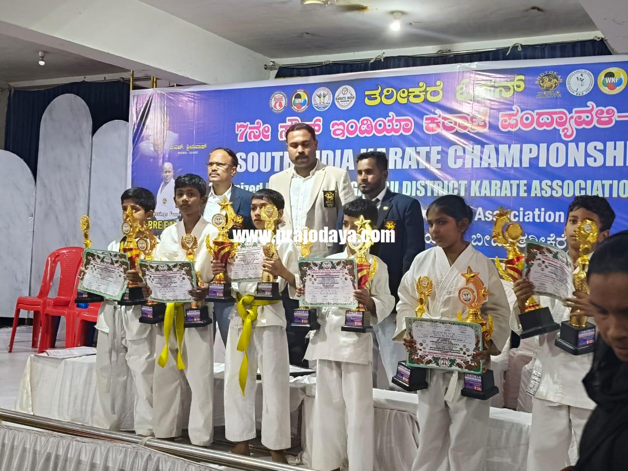 ಹಾಸನ: ತರೀಕೆರೆಯಲ್ಲಿ ಇತ್ತೀಚೆಗೆ ನಡೆದ ದಕ್ಷಿಣ ಏಷ್ಯಾ ಕರಾಟೆ ಪಂದ್ಯಾವಳಿಯಲ್ಲಿ ಹಾಸನದ ಕರಾಟೆ ಪಟುಗಳು ಕಥಾ ಮತ್ತು ಕುಮಟೆ ವಿಭಾಗದಲ್ಲಿ ಆಕರ್ಷಿಕ ಟ್ರೋಫಿ ಪಡೆದು ಜಿಲ್ಲೆಗೆ ಕೀರ್ತಿ ತಂದಿದ್ದಾರೆ.